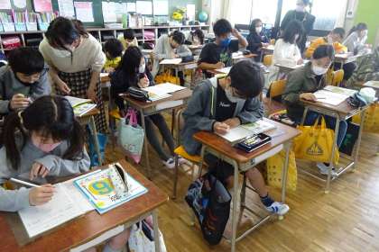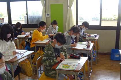 6年算数「ならべ方と組み合わせ方」の様子です。本時は、5種類のお菓子の中から2つ取り出す組み合わせが何通りあるかを考えました。「表や図をかく」「重なりを消す」「残りを数える」これらのことを使って考えることを確認し、問題を解いていきました。