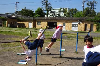 5年体育の様子です。本時は、鉄棒カードの内容を練習するグループと投力アップの練習をするグループに分かれて行いました。