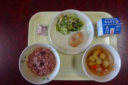 本日の献立は、「鶏肉の味噌焼き 野菜とじゃこの炒め物 うずらの卵とえのきのすまし汁 赤飯 牛乳」でした。