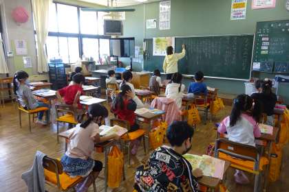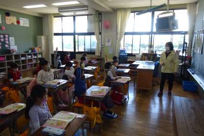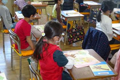 1年国語「えからみつけたよ」の様子です。教科書に載っている公園の様子を表した絵を見て、「何がいるのか」「何があるのか」を答えていました。みんな絵をよく見ていました。