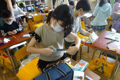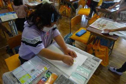 2年図工「たのしくうつして」の様子です。画用紙で型を作り、絵の具で型を写していきます。できあがった模様は、事前に描いた自分の顔の背景として使う予定です。