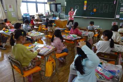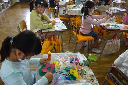 1年図工「ちょきちょきかざり」の様子です。折り紙を使ってつながる飾りをつくり、画用紙に貼っていきました。