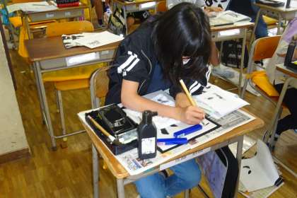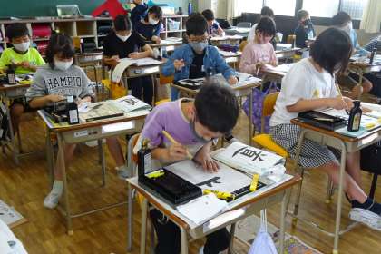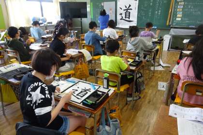 5年書写の様子です。本時の題字は、「道」。しんにょうが難しいと思いますが、がんばっていました。