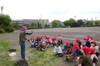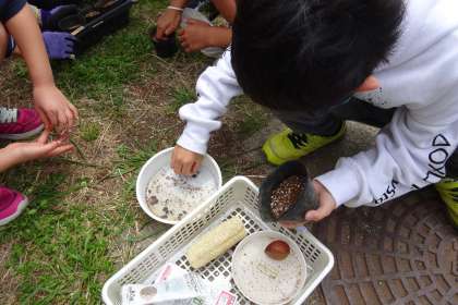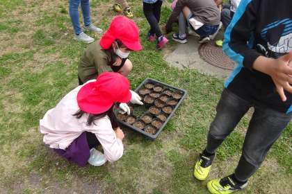 4年理科「季節と生物」の様子です。これからツルレイシを使って成長の様子を観察していきます。本時は、種の観察をした後、ポットに土を入れ種まきをしました。