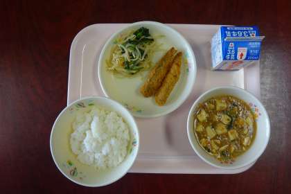 本日の献立は、「マーボー豆腐 小イワシフライ ナムル 自校米飯 牛乳」でした。