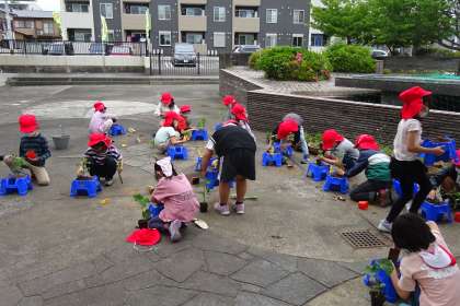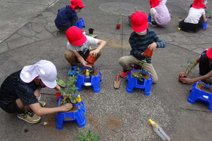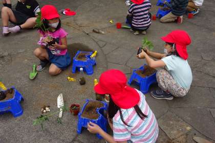 土を入れ、穴を掘り、ポットの苗を植え替えていきます。先生の注意事項をしっかり聴き、やさしく丁寧に植え替えていました。たくさん野菜がとれるといいですね。どんな世話をしたらよいのかを考えていきましょう。