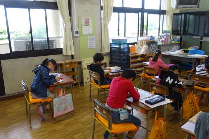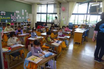 1年国語の様子です。今日は、ひらがな「み」の練習です。難しい字ですが、みんながんばっていました。