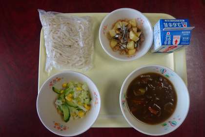 本日の献立は、「カレー南蛮 うどん ポテトと小魚のから揚げ ボイルドサラダ 牛乳」でした。