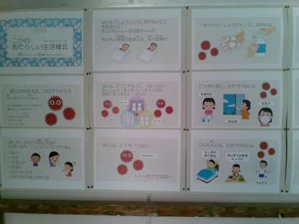 職員室前のコロナ予防の掲示物の写真も紹介します。