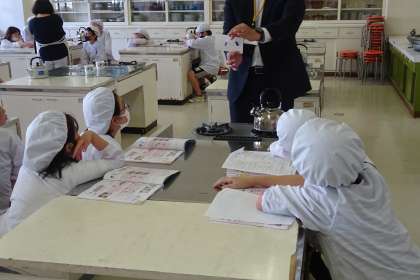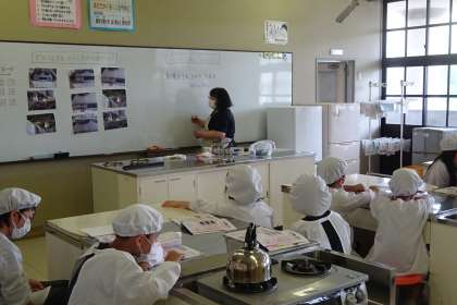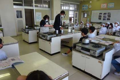 5年家庭「クッキング」の様子です。本時は、家庭科室で、ガスコンロの使い方とおいしいお茶の入れ方を学習しました。おいしいお茶を入れるには、どのくらいの熱さのお湯が適当なのかをカテキンの反応によって比較していました。実際に個々にお茶を入れて飲むことができないので、教師の実験によって確認していました。