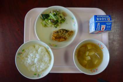 本日の献立は、「鯖の竜田揚げ ハムと野菜の炒め物 大根の味噌汁 自校米飯 牛乳」でした。