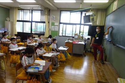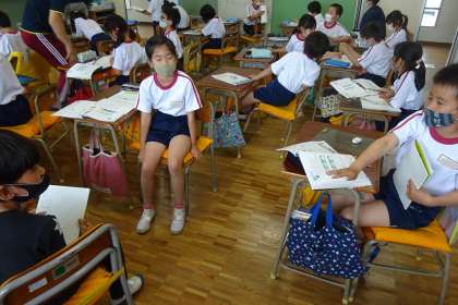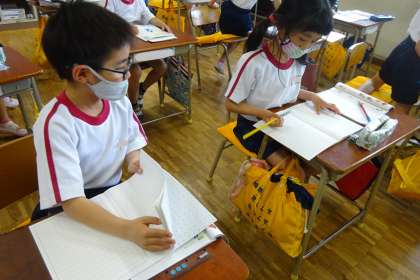 2年算数の様子です。「32+7+3」の式ができました。「これを計算するのに、速くて、簡単で、正確にできるやり方はないかな」と、各自やり方を考えました。写真は、互いに自分が考えた方法を説明し合っている様子です。