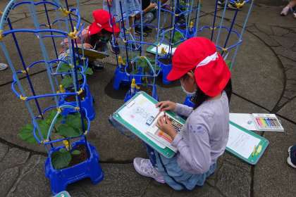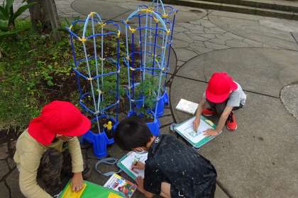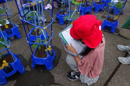 2年生活「わたしたちのやさいばたけ」の様子です。先日植えた各自の野菜の様子を観察していました。前回からの成長の様子を記録しました。