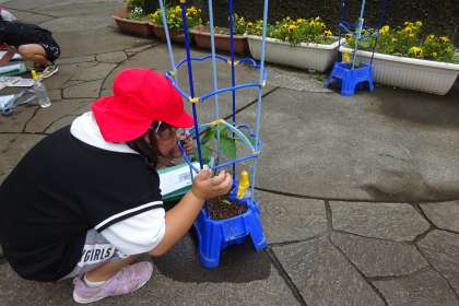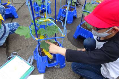 葉に虫がついていたので、その対処の仕方を先生に相談している子、野菜に鼻を近づけてにおいをかいでいる子、キュウリの花を見つけている子。みんなじっくりと観察をしていました。