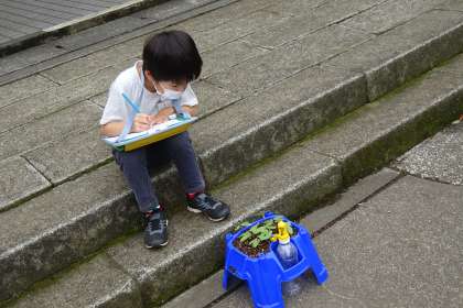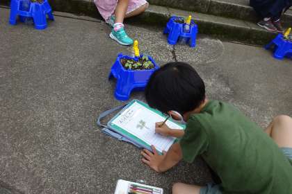 「私の芽には帽子がついてる。」と、種のからをつけた芽に驚いている子、葉の葉脈までよく見て描いている子。1年生も観察をがんばっていました。どの子も芽が出て良かったです。