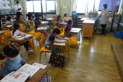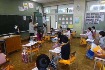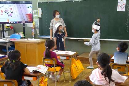 2校時、1年道徳の様子です。読み物資料「あなたならどうする?」を使って考えていました。登場人物のきつねとパンダの様子を動作化をして、自分の考えを広げていました。