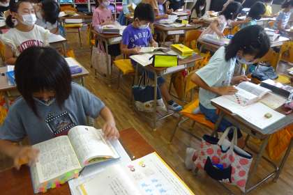 3年国語「いろいろな見方で分類しよう」の様子です。同じところに着目して分類していきます。教科書の説明の中で、分からない言葉が出てきたので、国語辞典を使って調べていました。4月に引き方を習ったので、みんな素早く調べられました。