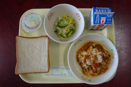 本日の献立は、「ミートグラタン ボイルドサラダ すりおろしリンゴゼリー 食パン 牛乳」でした。