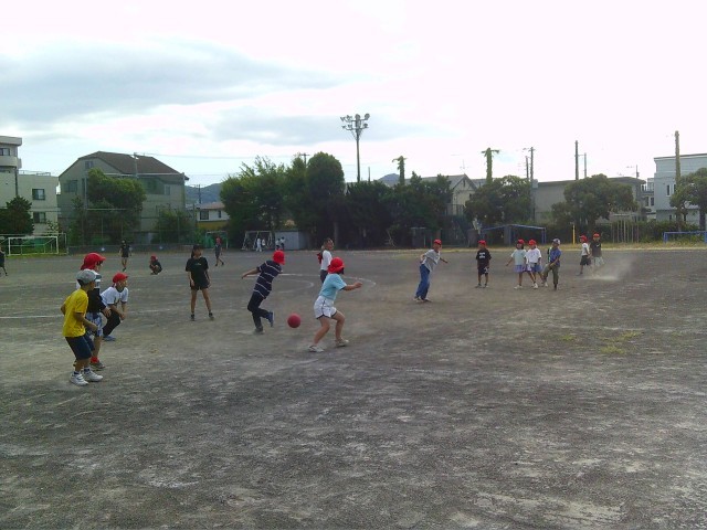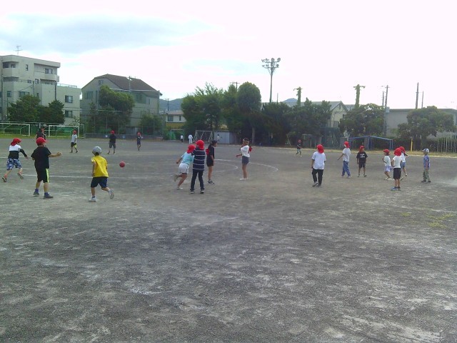 2年生と4年生が楽しそうにドッジボールをしています。