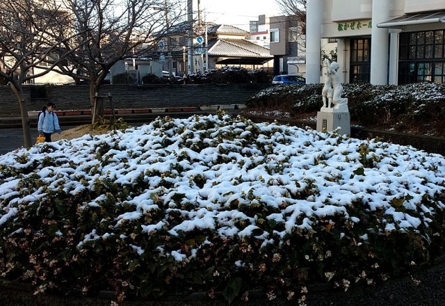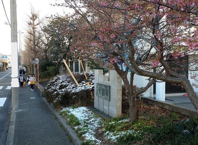 残雪の中を登校する子供たち、河津桜と雪のコントラストも見られました。