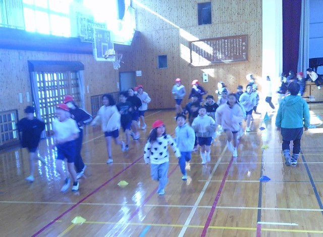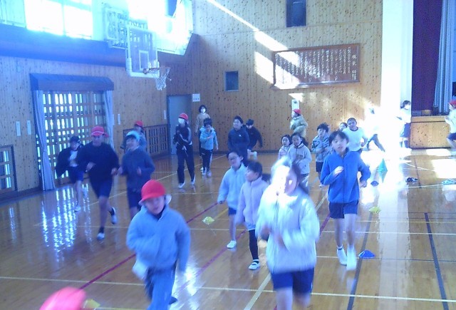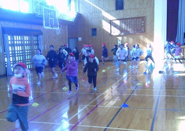 本日は運動場がぬかるんでいたため、体育館内でかけ足運動を実施しました!
