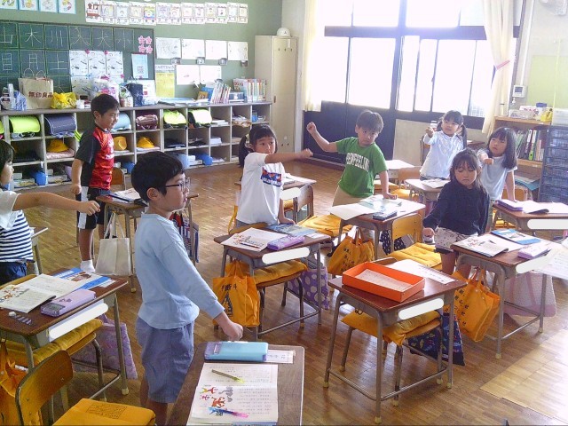 本文に書いてあることに実感が持てるよう動作を付けます。「力強く くりん くりん とまぜる」とは・・・?