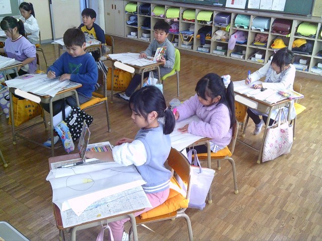 生活科で凧を作っています。高く舞い上がるように願いを込め、どのような凧になるか楽しみです。