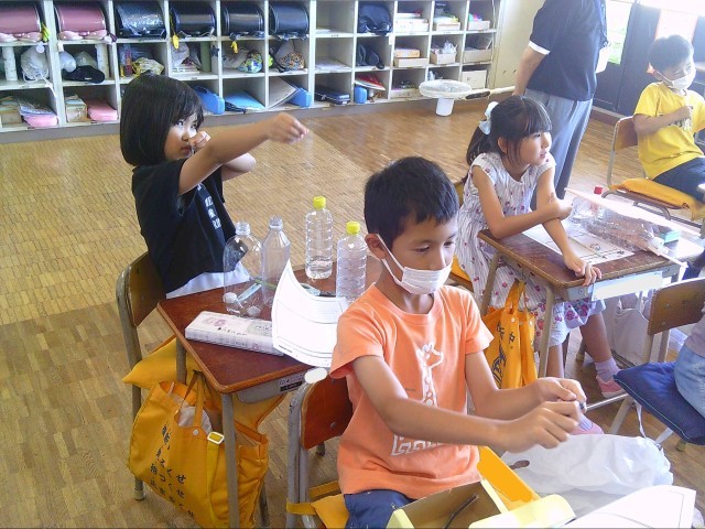 〇〇の力でうごくおもちゃづくりが進んでいます。ゴムの力、水の力、風の力などみんな工夫をこらしています。