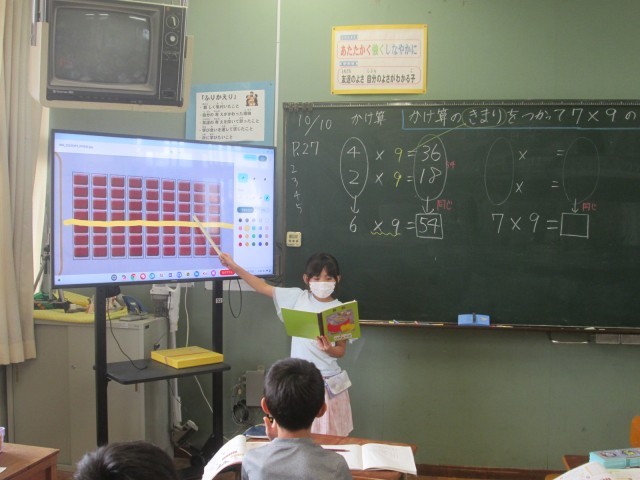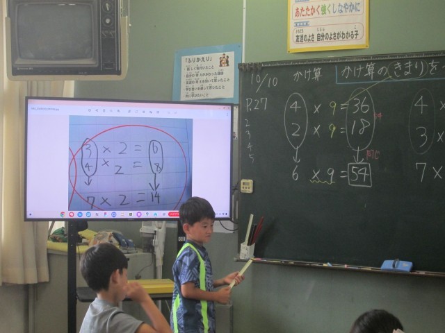 2年生は、画面に映しながらみんなで考えています。かけ算のしくみについて、張り切って説明しています。