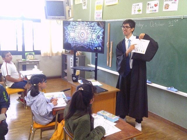 英語の指導をしてくれているスペンサー先生が、本日はハロウィンということでコスプレをしながら授業を実施してくれています。話した英語をテキスト内から探す学習に取り組んでいます。