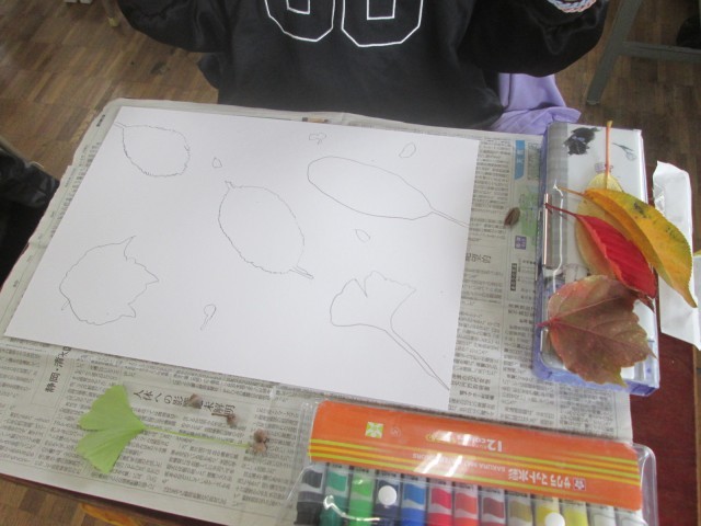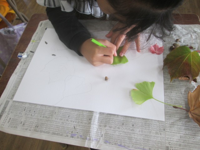 今日は、拾ってきた落ち葉やどんぐりを用いてデザインを考えながら紙になぞっていました。