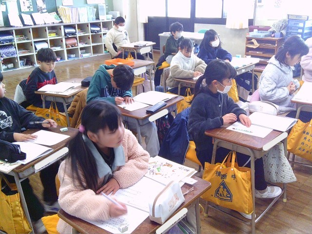 3年生は国語のまとめとして学んだ漢字について覚えているかどうか確認しています。ちなみに教室後方には図工で作ったオリジナルストーリーの絵本が飾られていました。