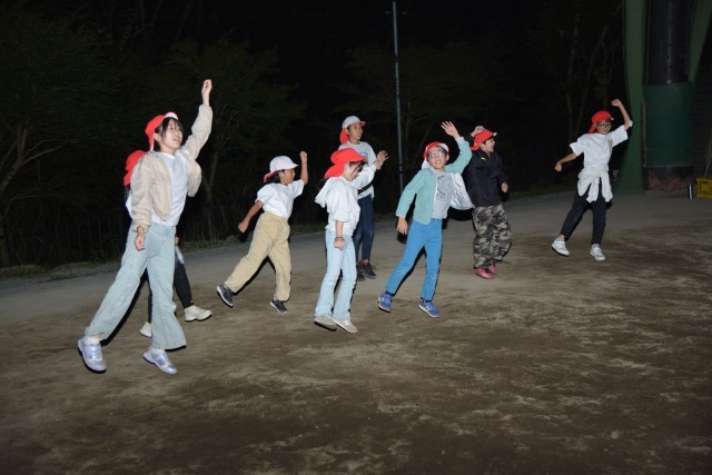 昨夜のキャンプファイヤーの様子です。火を囲みフォークダンスで大盛りあがりでした。