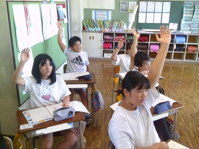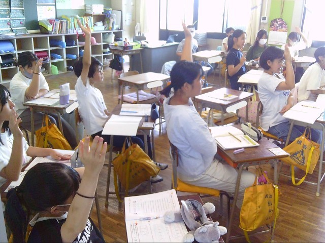 分数の大きさに関する学習です。先生の質問に対して手を上げて答えようとする子がたくさんいます。