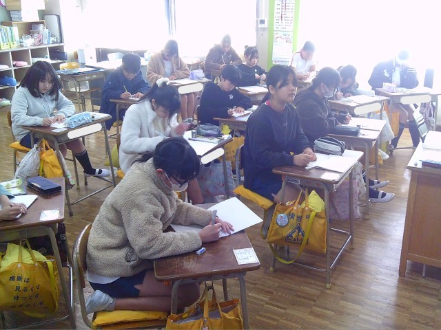 5年生は書き初めを練習しています。話し声が一切聞こえない中、緊張感を高めて筆をとっています。