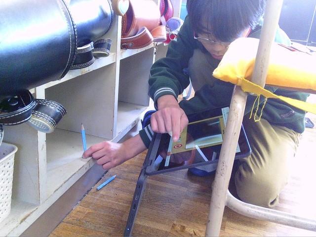 端末を用いた体積の学習です。新型端末の特性を生かし、画面に手書きで数値等を記録、記録した自分の考えをアプリで共有し、授業中でも家に帰ってからの復習でも見れるようにしつつ、先生も確認できるようにしています。記録をこまめに取ることで、自分の考えの途中経過を保存できるという利点もあります。