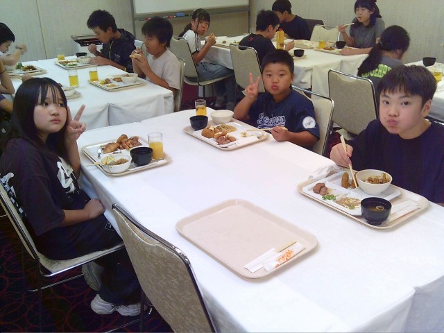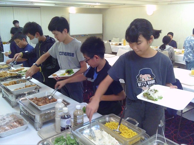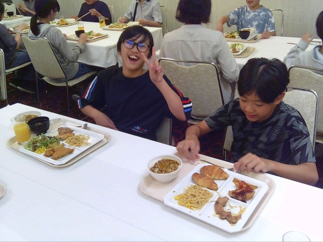 夕食です!バイキングメニューは、各種野菜サラダ、鶏の照焼、白身魚フライ、メンチカツ、アサリのパスタ、フライドポテト、カレー、味噌汁、ごはん、パン、クロワッサン、チョコレートケーキ、リンゴジュース、オレンジュース、緑茶、などよりどりみどりです!このあとは部屋に戻って一日の振り返り・入浴・就寝です。