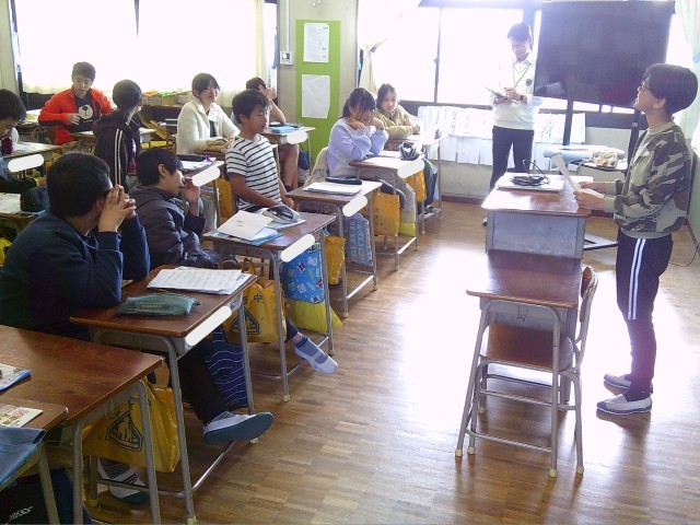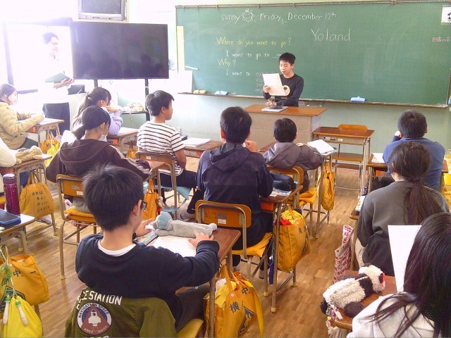 Where do you want you go ? Why ? に対して自分が考えていることを全体に発表しています。3文以上で答えるようにしている中、7文で自分の思いを伝える子もいました。