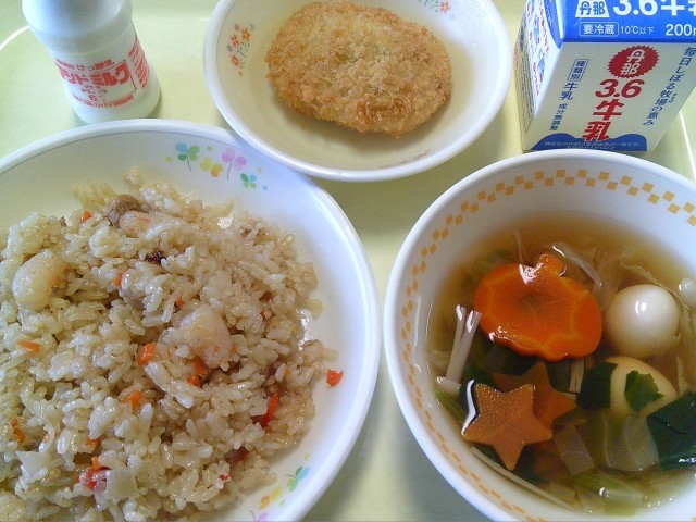 学校給食 本日は、ナシゴレン、野菜コロッケ、ウズラ卵と野菜のスープ、発酵乳、牛乳です。ちなみに、給食室のみなさんがスープの人参をハロウィン仕様で☆やカボチャの形に切り抜いてくれました!