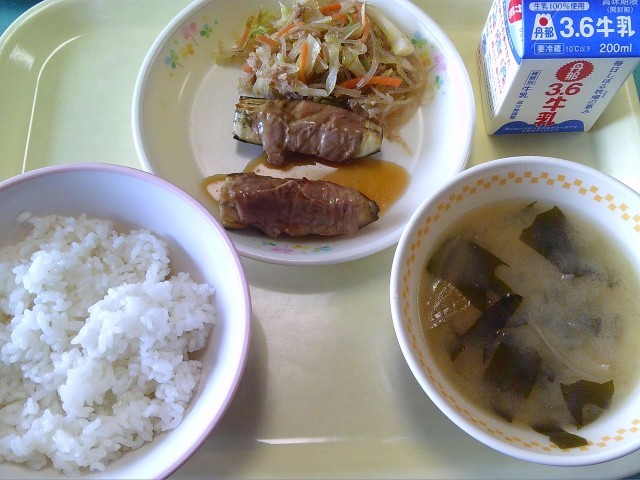 本日は、ナスの肉巻き、ツナと春雨の炒め物、鶏団子入りみそ汁、ご飯、牛乳です。