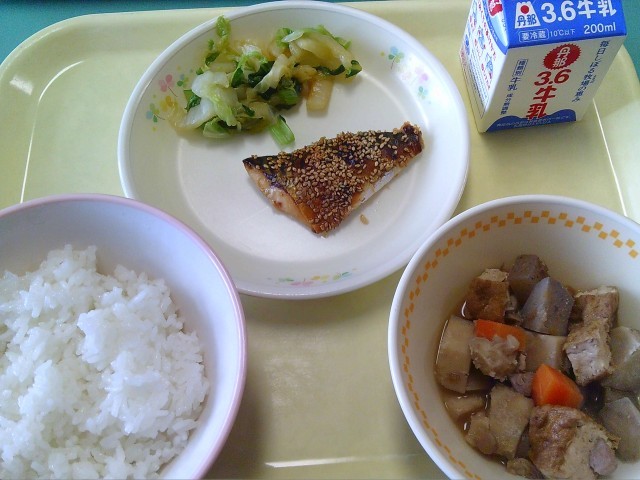 本日は、鯖のごまみそ焼き、大中寺芋と厚揚げの煮物、白菜のおひたし、ご飯、牛乳です