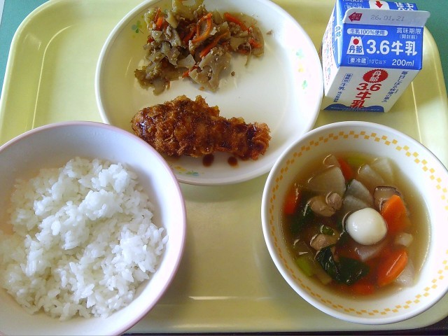 3学期最初の給食は、お雑煮、鱈のサクサクフライ、レンコンのきんぴら、ご飯、牛乳です。