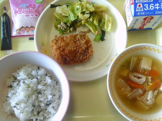 本日は、ぶりフライ、中華風コーンスープ、ひじきの中華炒め、ごはん、牛乳です。
