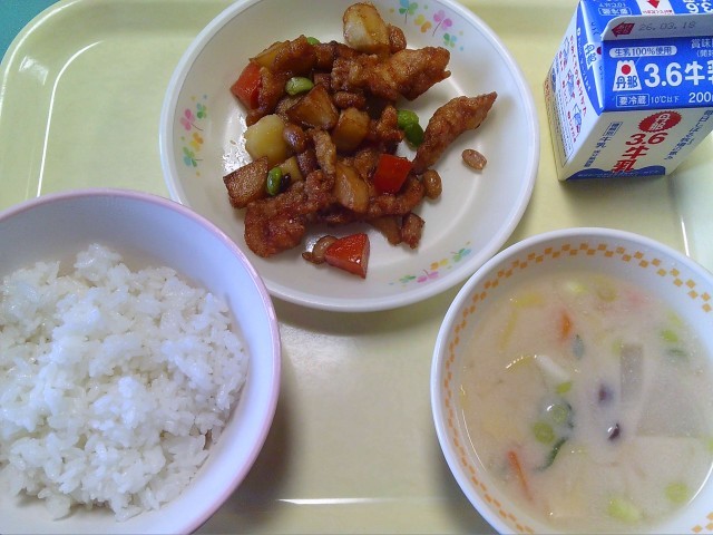 本日は、鶏肉とジャガイモの揚げ煮、豆乳味噌スープ、ごはん、牛乳です。