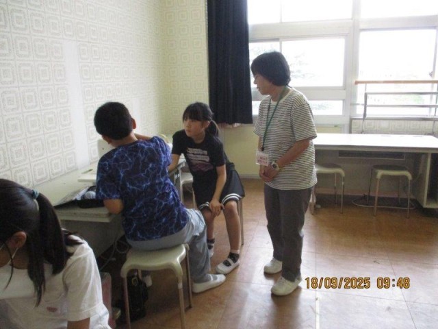 5年生と6年生は、家庭科でミシンの学習をしています。教員一人では指導が難しいため、地域の方々の御協力でミシンの使い方を教えていただいています。