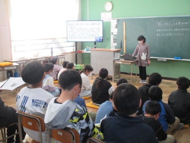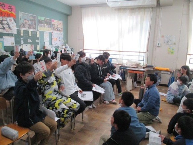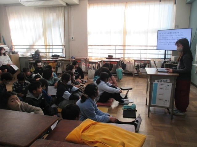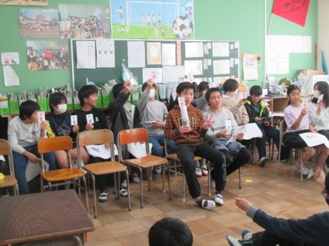 5年生は、国語で今まで学んできたことを6年生にプレゼンしました。6年生はそのプレゼンを聞いて、自分の意見を決め、最後に投票を行いました。