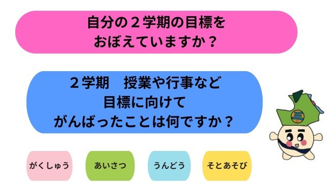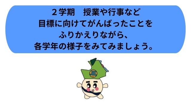 2学期の終業式では、校長から、2学期を写真を通して振り返ってみようという話をしました。自分の目標に向かって、授業や挨拶や運動などに頑張っていることを、じっくり振り返る時間となりました。