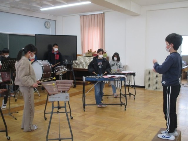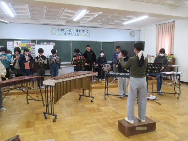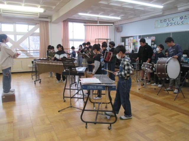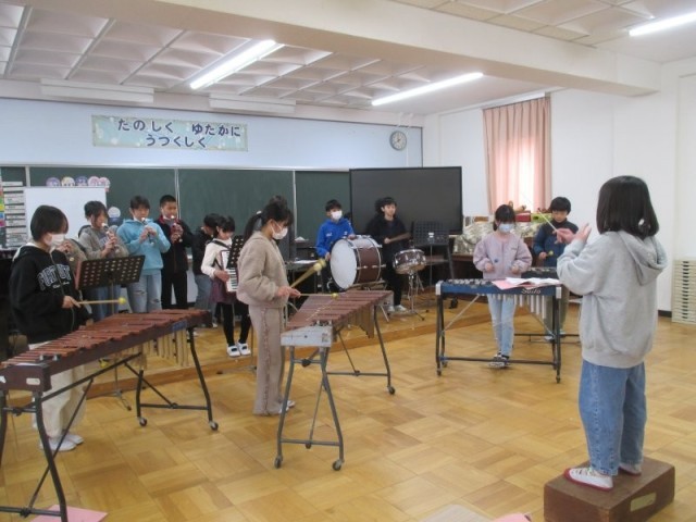 5年生の音楽発表会が開かれました。指揮者や打楽器の拍子に集中して合わせて、迫力のある楽器演奏を聴かせてくれました。