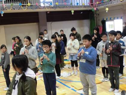 6年生を送る会の最後には、5年生の演奏にのせ、1年生と手をつなぎながら、4年生の花のアーチをくぐって、6年生が退場しました。