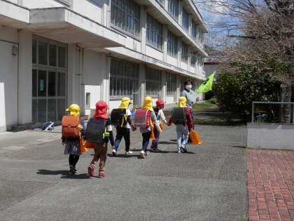 下校のコースごとに分かれ、担当の職員と一緒に出発します。
